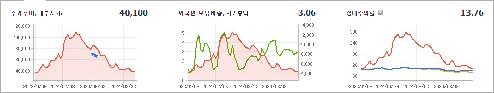 가온칩스의 현재 주가는 40,100원으로, 전일 대비 5.98원 하락했습니다. 주주 현황을 살펴보면 정규동과 그 외 7명이 총 48.86%의 지분을 보유하고 있습니다. 가온칩스는 반도체 및 관련 장비를 다루는 기업이며, 장중 주가는 40,100원입니다. 이 회사의 시가 총액은 4,601억 원이며, 총 발행 주식 수는 11,488,320주입니다. 외국인 보유 비율은 3.06%이며, 장중 거래량은 100,522주에 달했습니다. 또한, 가온칩스는 412억 원의 매출을 기록했습니다.