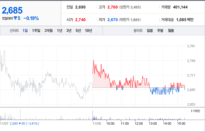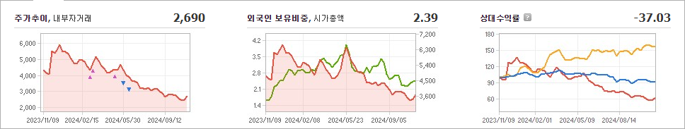 현재 신라젠의 주가는 2,690원으로, 전일 대비 95원 하락했습니다. 주주 현황을 보면 엠투엔 및 기타 두 명이 15.96%의 지분을 보유하고 있습니다. 신라젠은 바이오 기업으로, 현재 주가는 2,690원입니다. 회사의 시가 총액은 3,688억 원이며, 발행된 주식 수는 137,367,125주입니다. 외국인의 보유 비율은 2.39%이고, 장중 거래량은 613,945주에 이릅니다. 신라젠의 매출액은 11억 원에 달했습니다.
