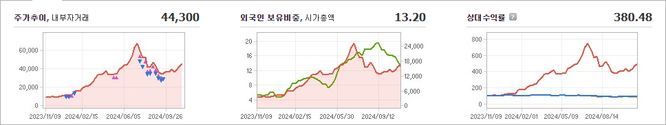 현재 테크윙의 주가는 44,300원으로, 전일 대비 변화가 없음을 보여주고 있습니다. 주주 현황을 보면, 나윤성(외 3인)이 총 13.47%의 지분을 보유하고 있습니다. 테크윙은 반도체 및 관련 장비를 다루는 기업으로, 장중 주가는 44,300원입니다. 이 회사의 시가 총액은 1조 6,510억 원이며, 발행된 주식 수는 37,353,645주입니다. 외국인 투자자의 보유 비율은 13.20%이며, 장중 거래량은 1,104,418주에 달했습니다. 매출액은 억 원을 기록했습니다.